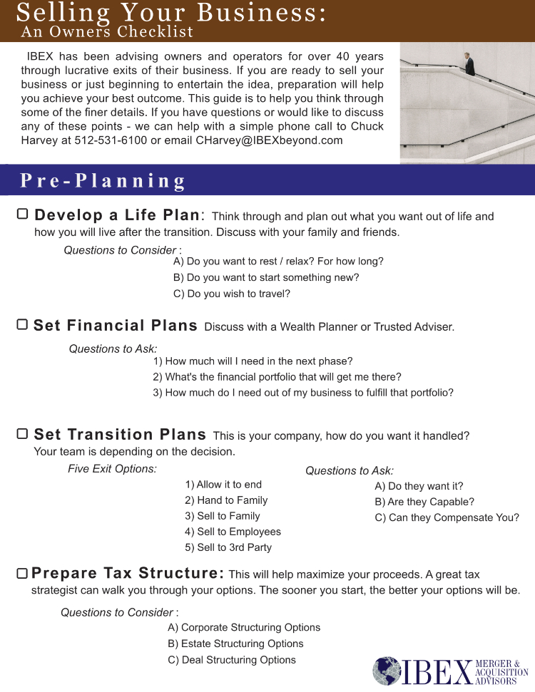 Prior to purchasing IBEX, Chuck Harvey spent 35 years as CEO, CFO and consultant to the Fortune 500, Middle Market, Mainstreet and in the Start-up community, including spending time at PepsiCo & Price Waterhouse Coopers. During that time, Chuck oversaw three dozen buy-side / sell-side transactions on three continents, including a $35M sale of a Texas digital photography pioneer to a $1 Billion Japanese conglomerate.